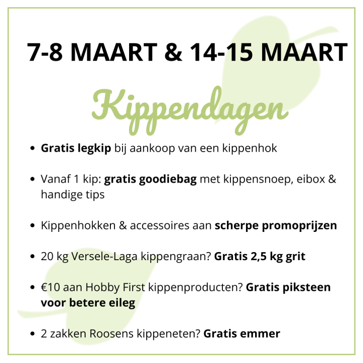 Maart wordt een feestmaand bij Tuincentrum Bloemenland, want we organiseren maar liefst twee opendeurweekends! Zet 6, 7 en 8 maart én 13, 14 en 15 maart alvast in je agenda, want er valt heel wat te beleven. Deze twee weekenden staan helemaal in het teken van onze kippendagen! We hebben weer een prachtige selectie kippen klaarstaan die je direct kunt kopen of vooraf kunt bestellen via e-mail. Mis deze kans niet om jouw kippenhok uit te breiden met gezonde, levendige kippen!