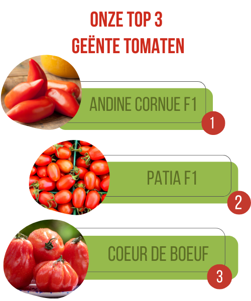 - Coeur De Boeuf: Een ware smaakbom met een uniek geribd uiterlijk – een echte blikvanger in de tuin! Sappig, vlezig en vol karakter: perfect voor verfijnde salades en zomerse gerechten.